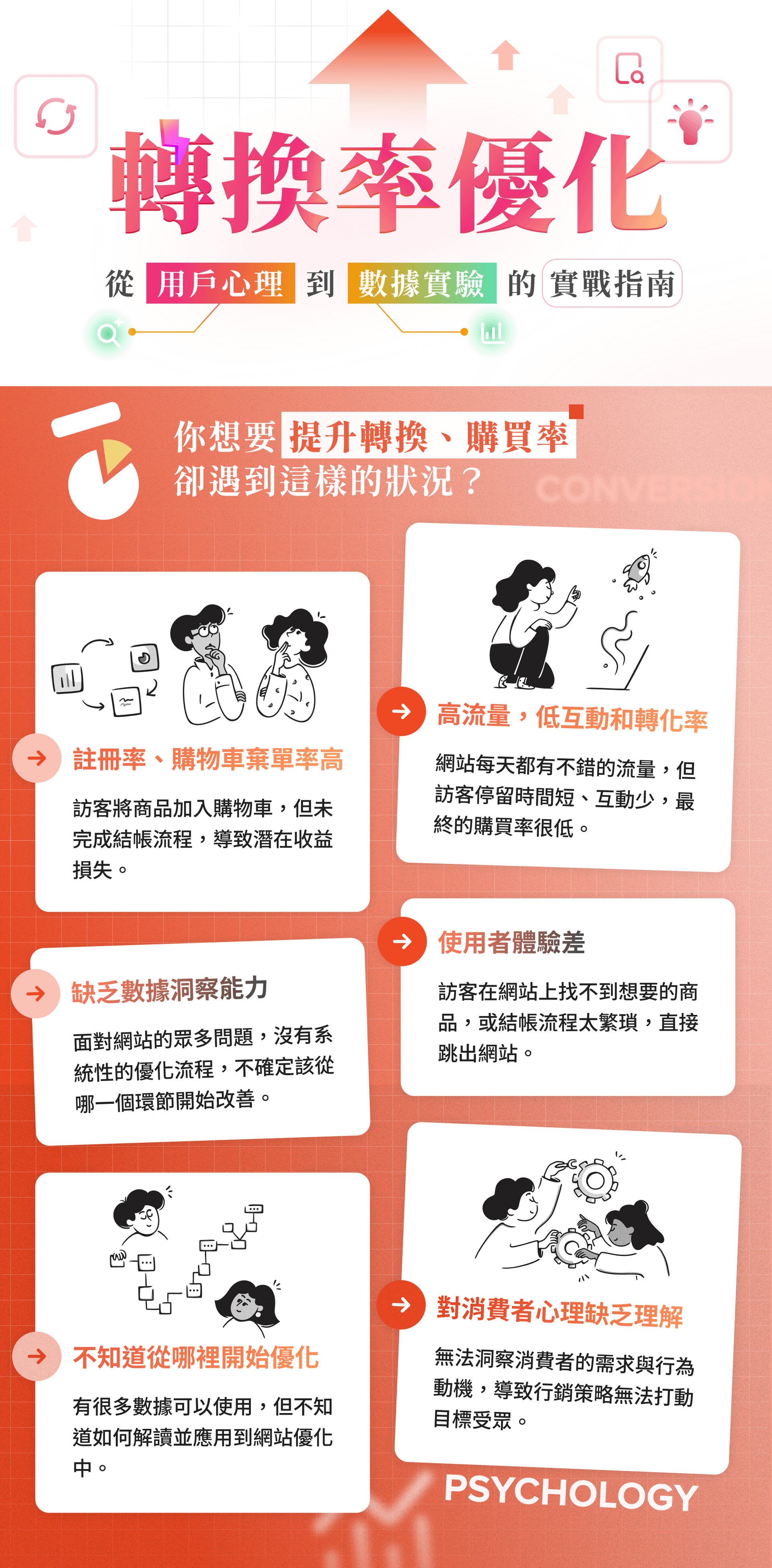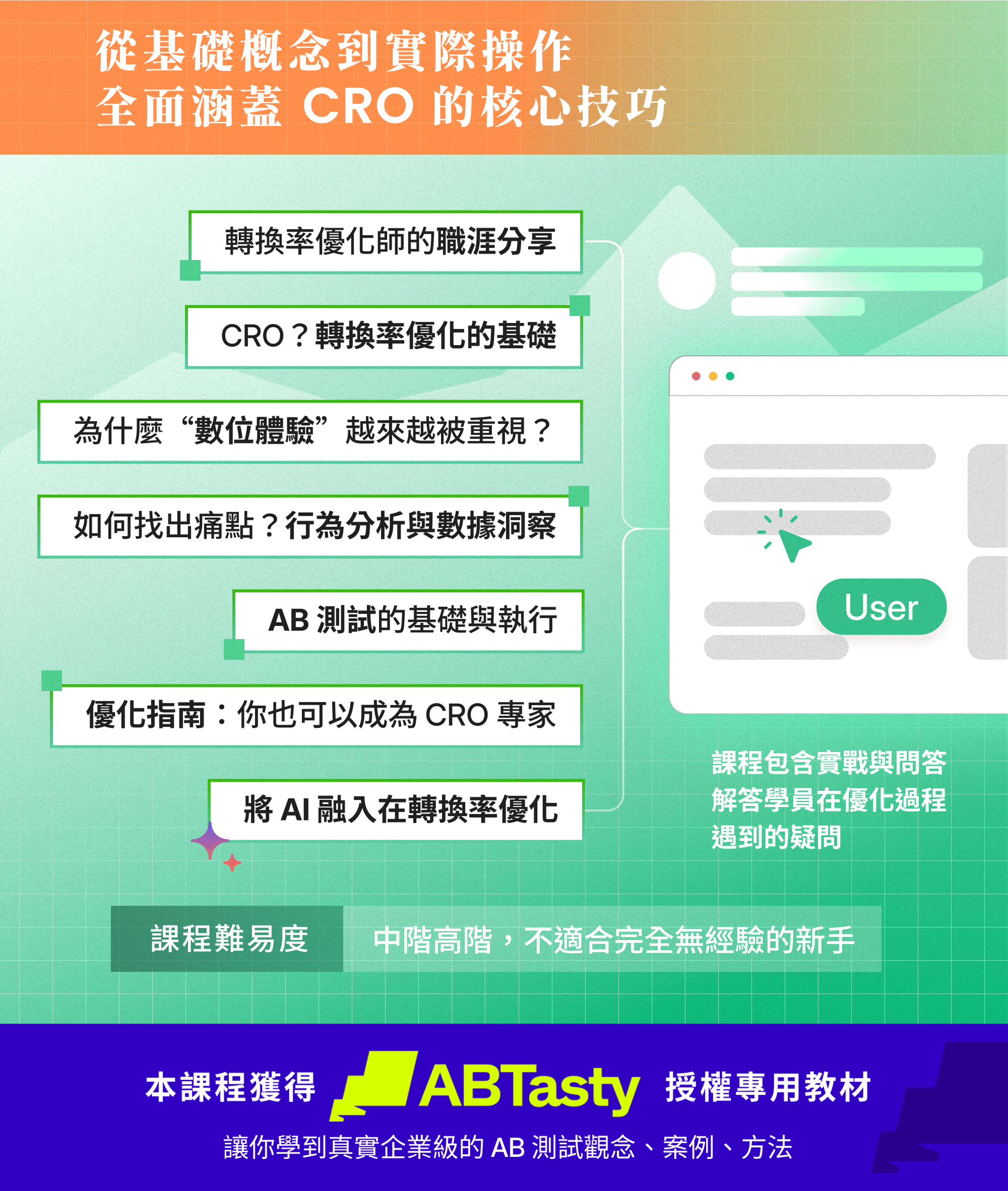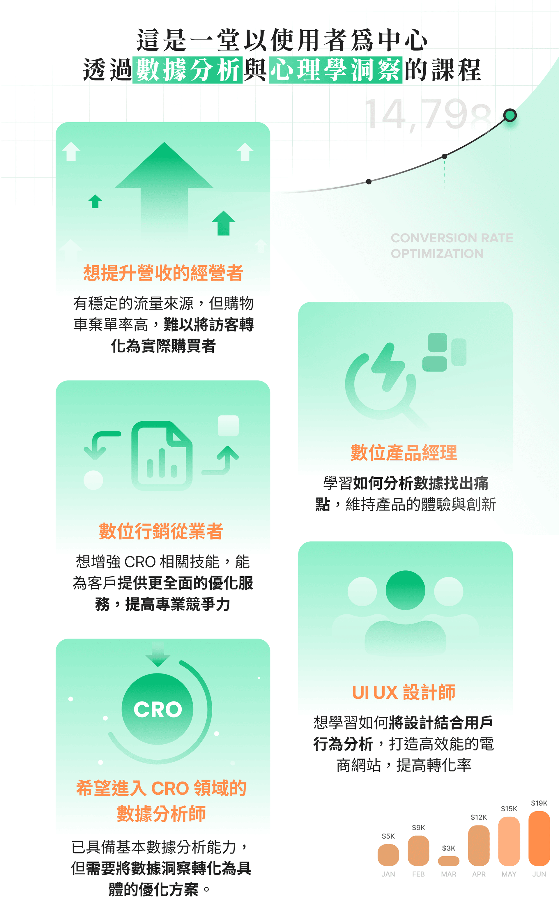 這門課程從人性化和數據驅動的角度全面探討CRO領域。聚焦在提升用戶體驗和增加轉換的核心目標。即使是CRO初學者,也能透過這門課程開始以系統化的方式識別和解決痛點,從而進入一個良性的優化循環。
