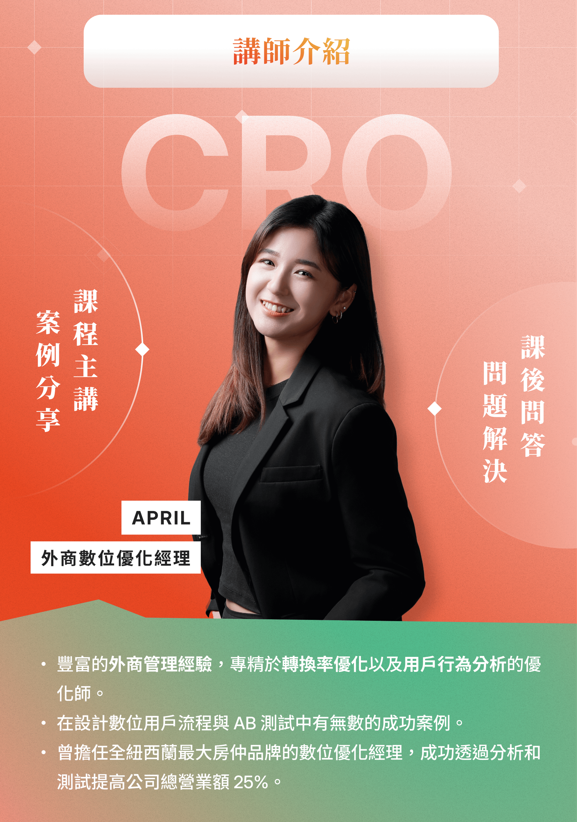 轉換率優化(CRO)對於改善用戶體驗和了解數據洞察都是非常關鍵的。CRO能夠通過優化產品和體驗,提升投資回報率。April是一位樂於助人且知識豐富的專家,她將引導您了解CRO的關鍵基礎原則,並提供可以立即應用的實用技巧!