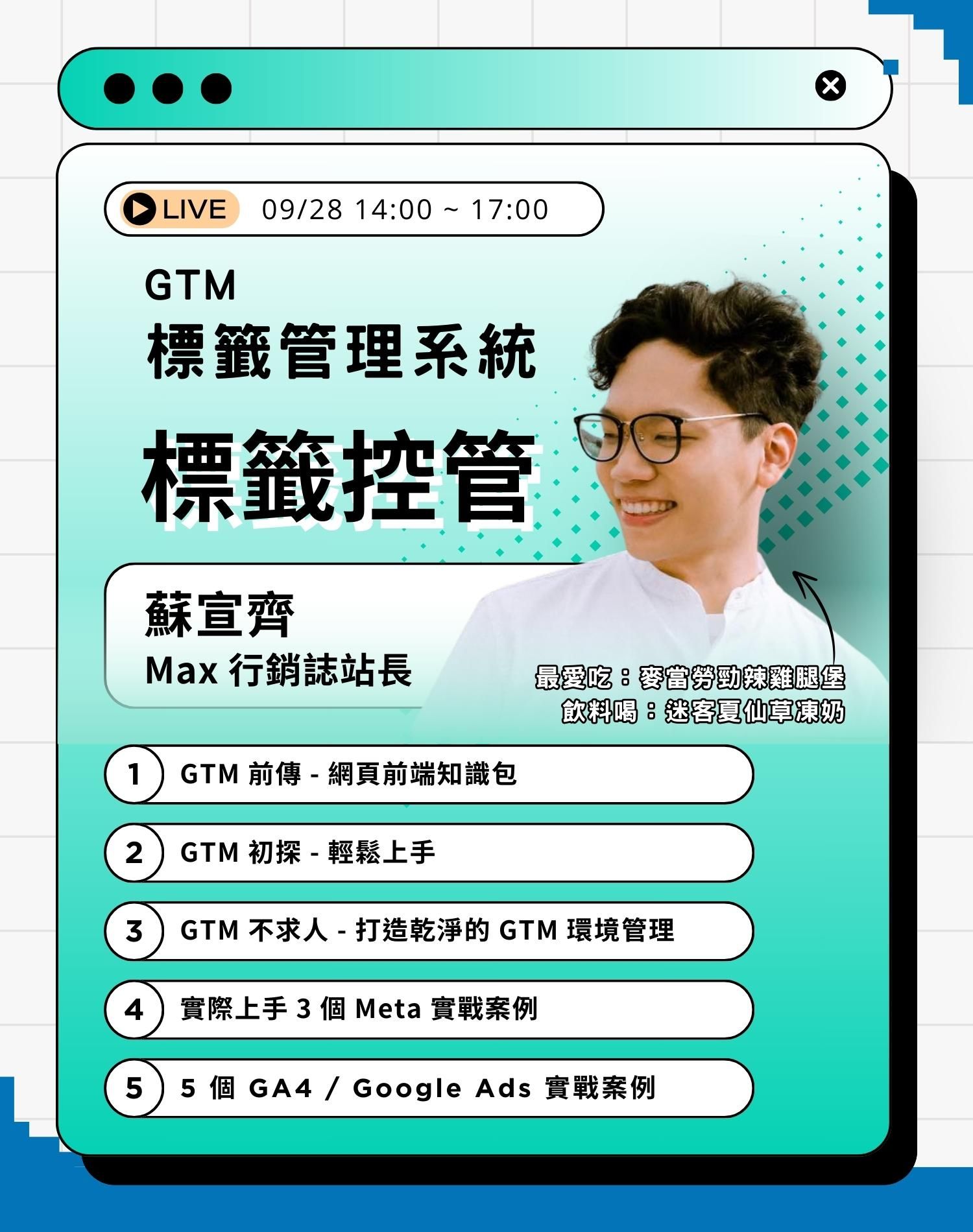 本次課程特別邀請到「Max 行銷誌」的站長 蘇宣齊 Max ,在你遇到行銷與數據問題時,總是會在網路上看到他的部落格,這次由他本人為你親自示範 GTM 的用法。