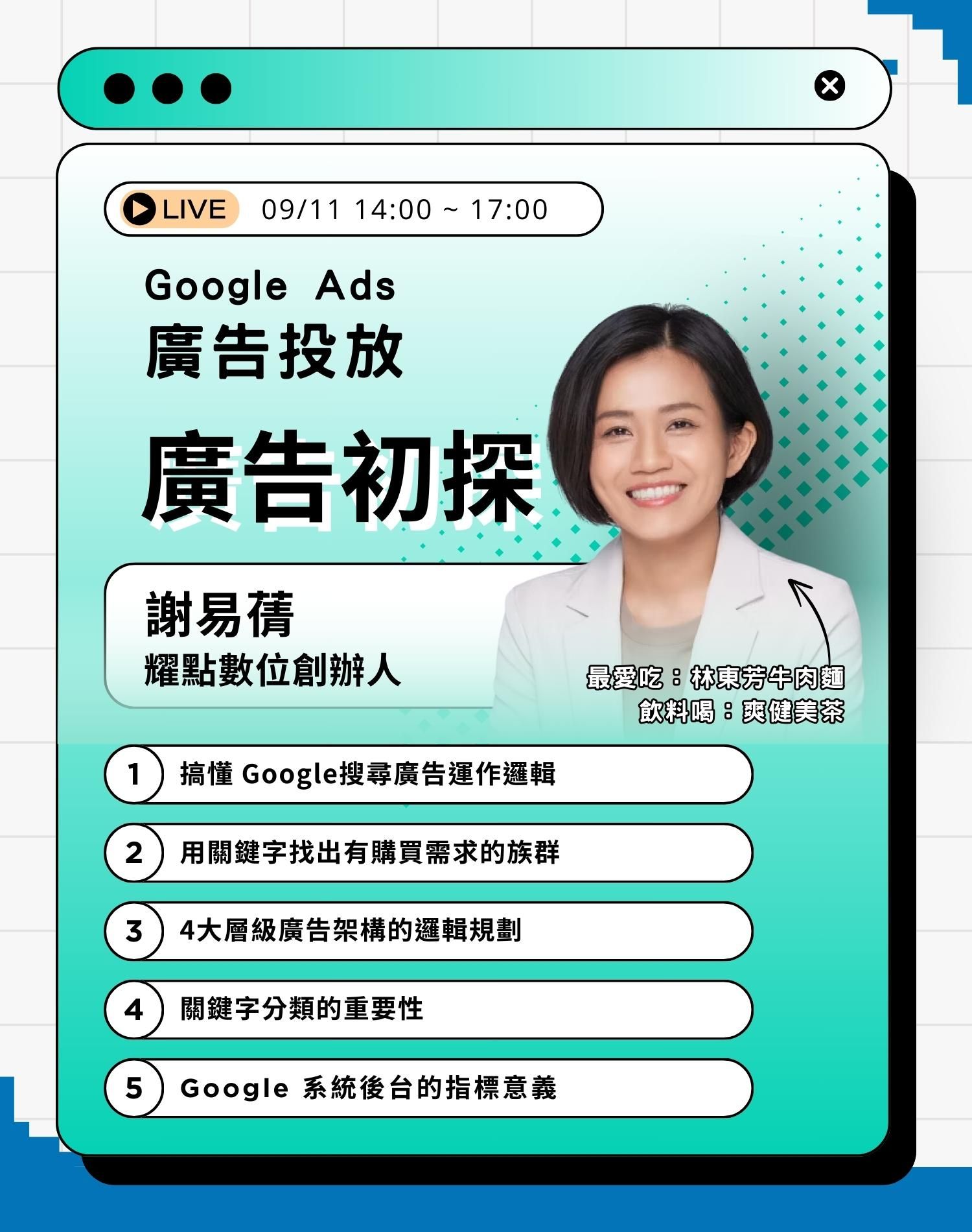 本次特別聘請到 耀點數位的創辦人 謝易蒨 Alisa 老師,是台灣許多現任 Google 廣告投手的老師,擁有十多年的教學與顧問經驗。