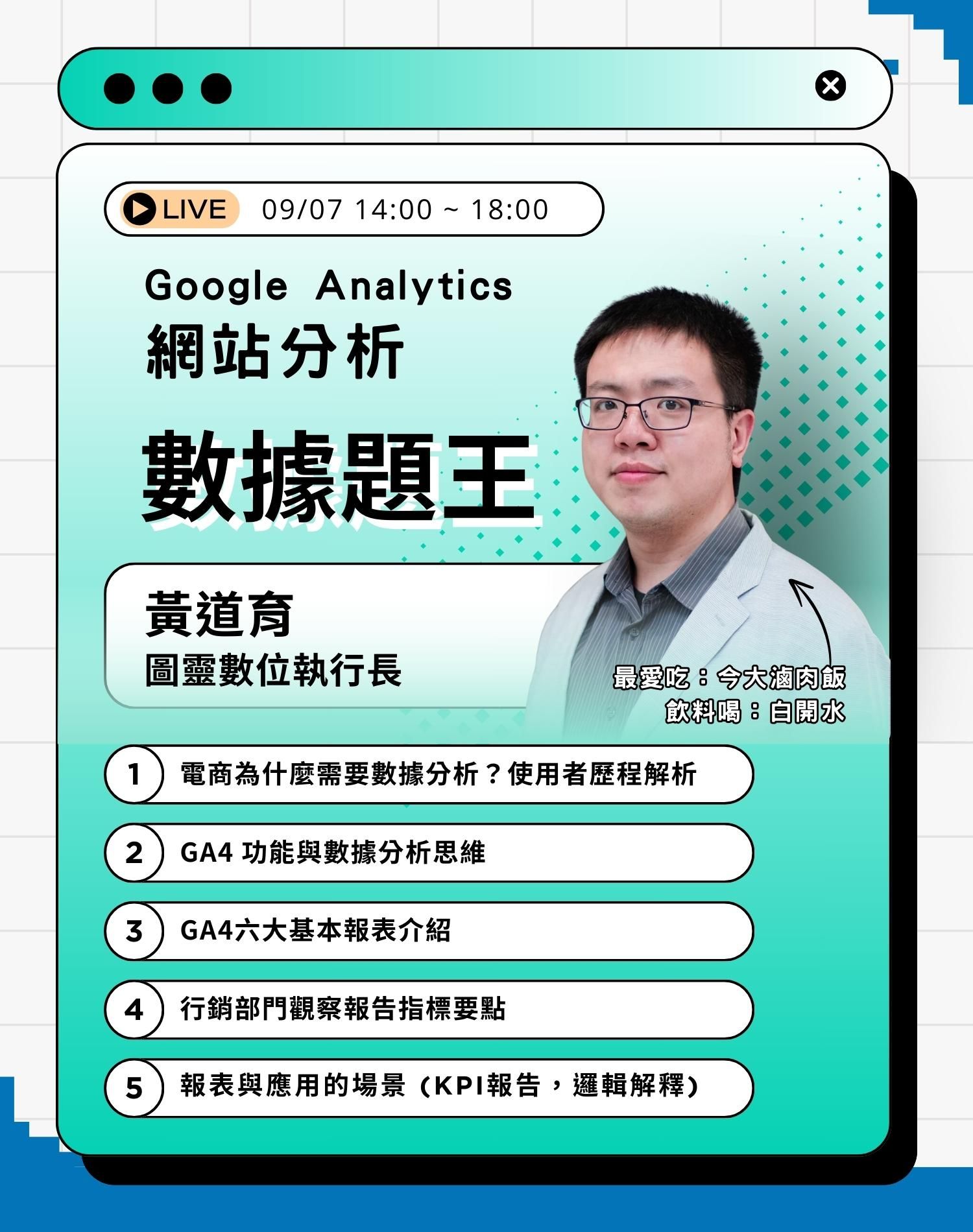 本次特別聘請到白金級的 Google 專家 黃道育老師為大家親授這堂課,目前為「圖靈數位」的創辦人,長年解決台灣 GA4 數據分析各種疑難雜症。