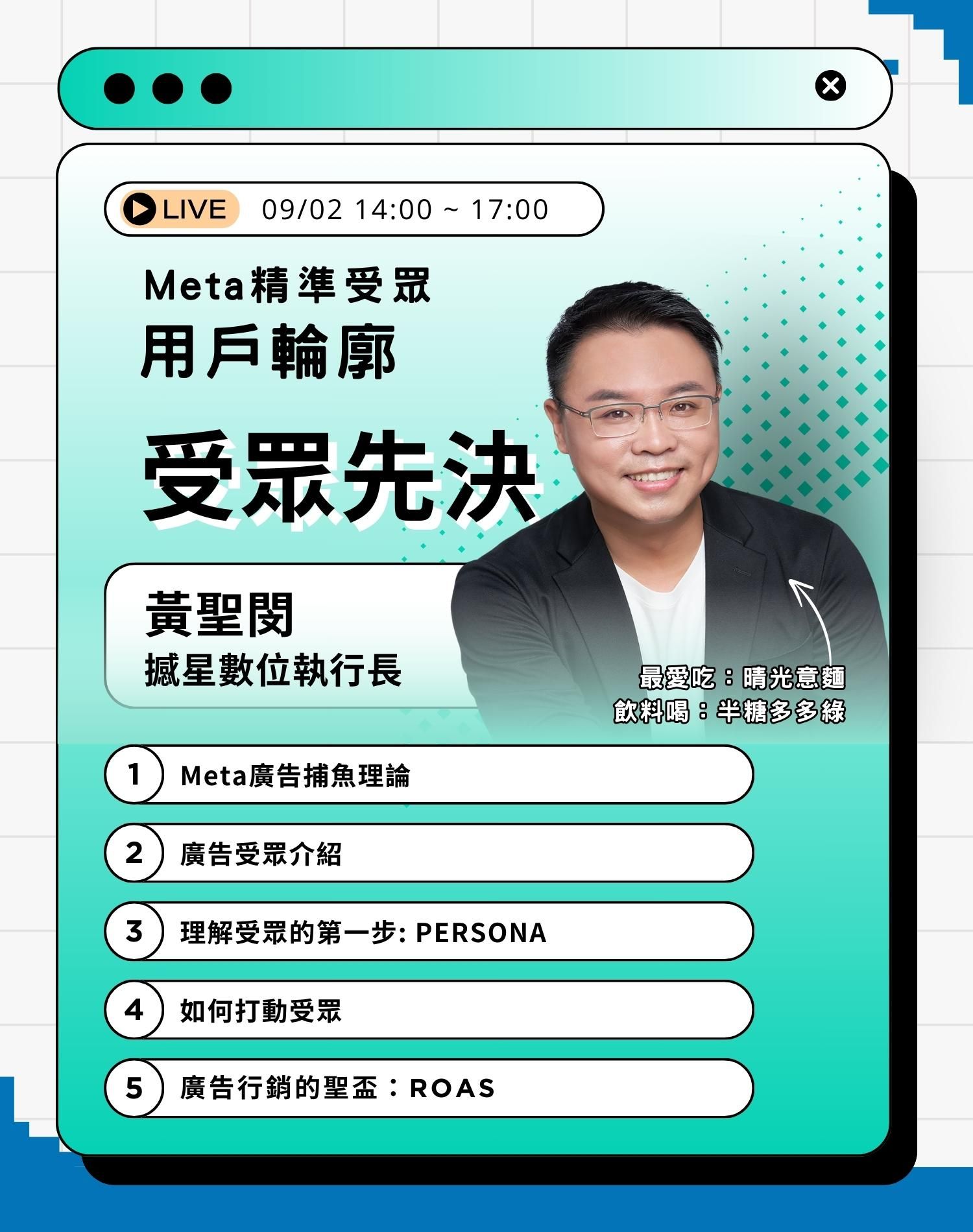 Meta 廣告是數位行銷人每天都會看到的,訪間已經有很多基礎設定的課程,這堂直播課將會著重教你如何定位你的受眾、找到精準的用戶才能有效的把錢花在刀口上。