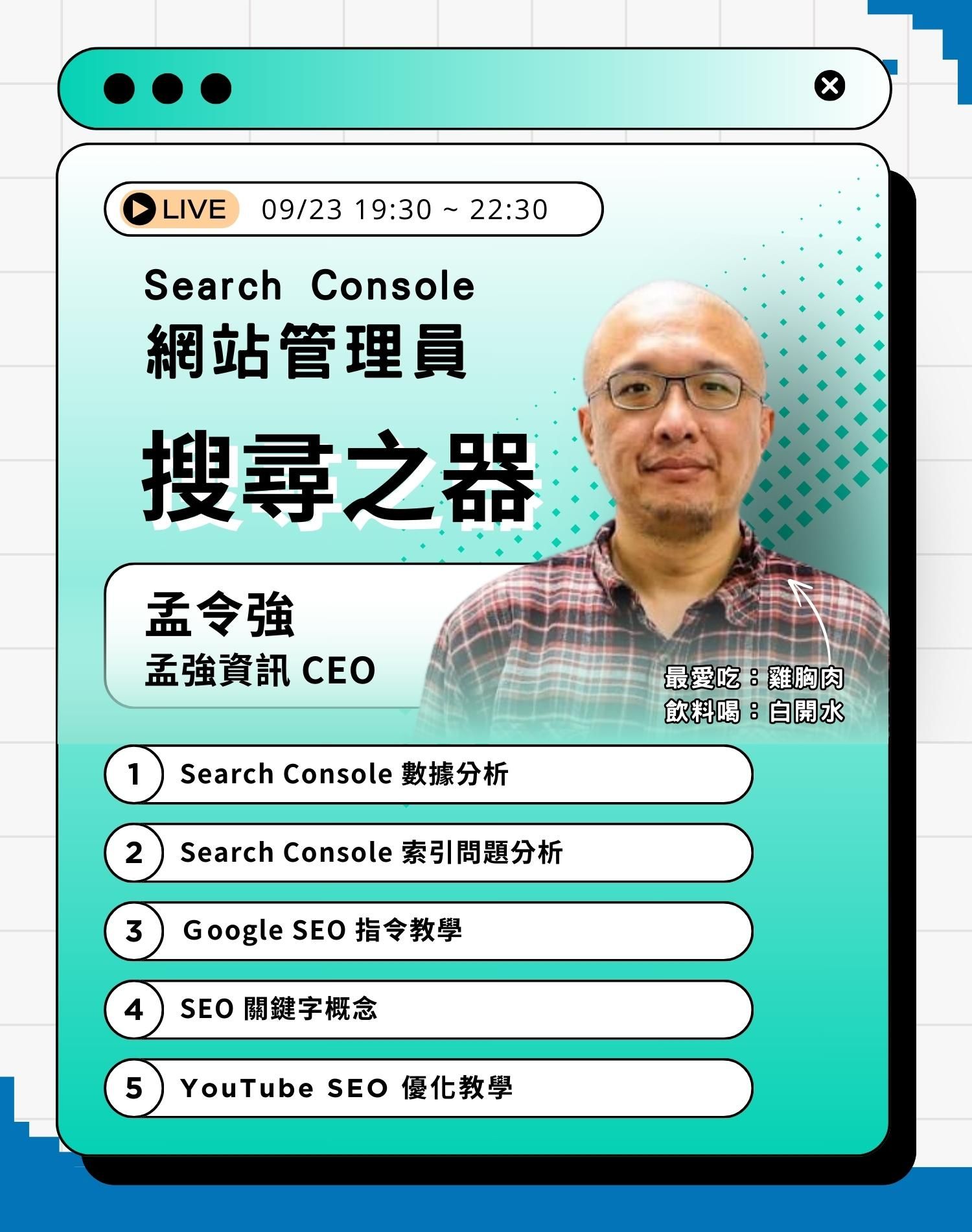 本次特別邀請到 Search Console 的資深玩家 孟令強老師,目前是孟強資訊的創辦人,擁有多年的實戰經驗與授課經驗。