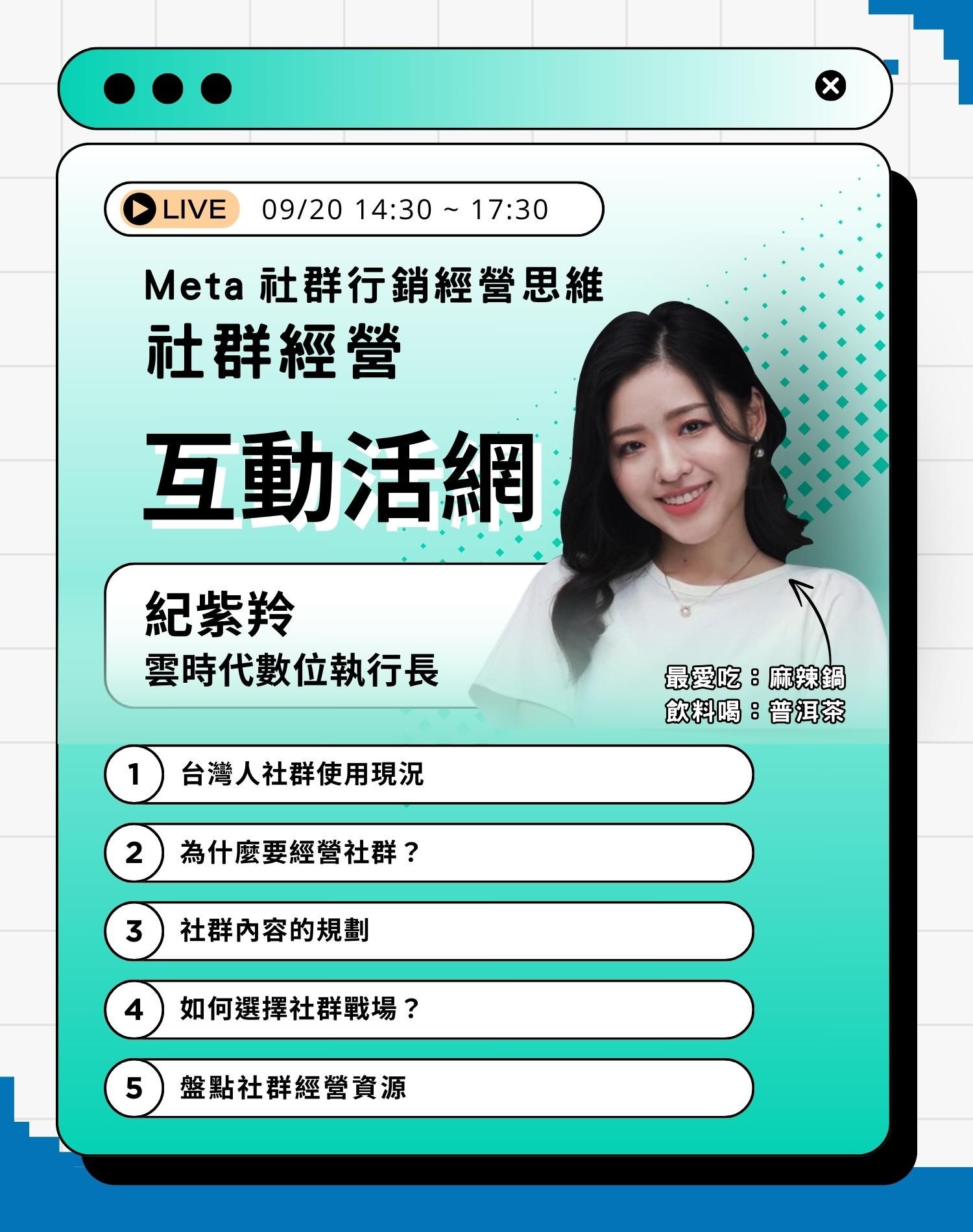 本次邀請到出租小編、雲時代數位的創辦人 紀紫羚(Abby) 老師,藉由豐富的社群操作經驗,讓你經營出品牌的網感、建立高互動的活網帳戶。