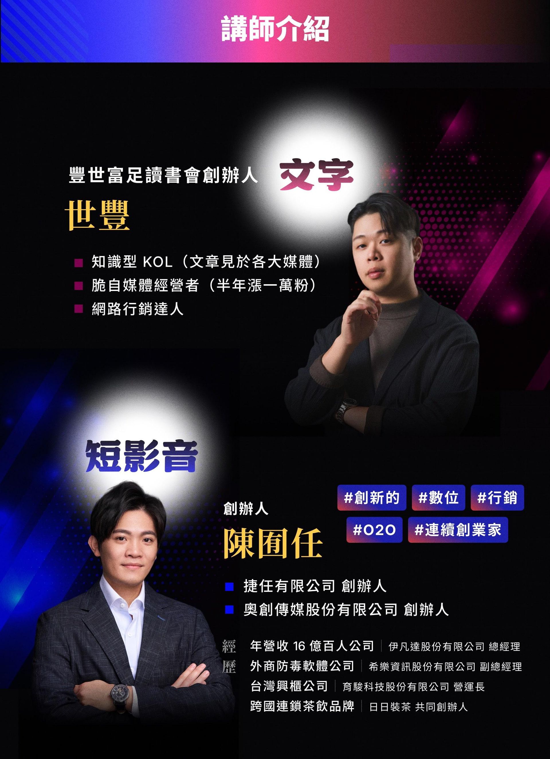 在這個資訊爆炸的時代,你是否在迷惘:究竟該走 Threads 的「脆」之路,還是深耕短影音平台?現場將邀請兩位經驗豐富的講師,透過現場實戰案例、數據對決與經營策略解密,帶你深入了解兩大平台的精髓與經營訣竅。活動尾聲還有精彩的雙講師沙龍座談,讓你有機會與講師零距離互動,深入討論你的疑惑!