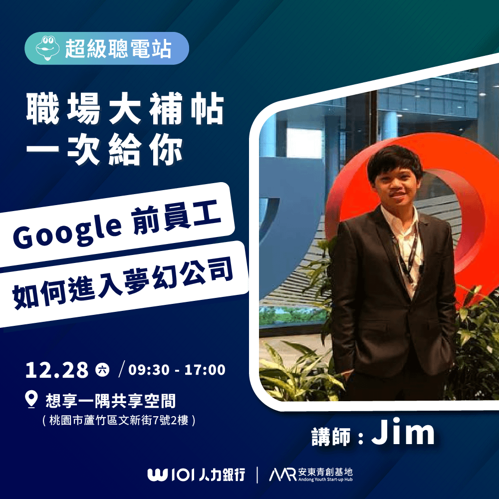 你是否曾夢想進入 Google 工作?這場講座,將由曾成功打入 Google 的職場達人 Jim,親自分享他的獨家心得,帶你走進科技巨頭的世界!