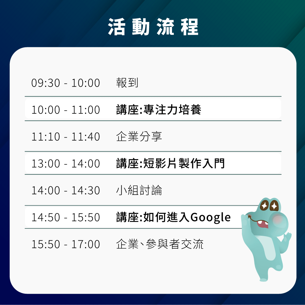 一日學習新技能,結識新朋友,還能挑戰真實企業題目,讓你不虛此行!