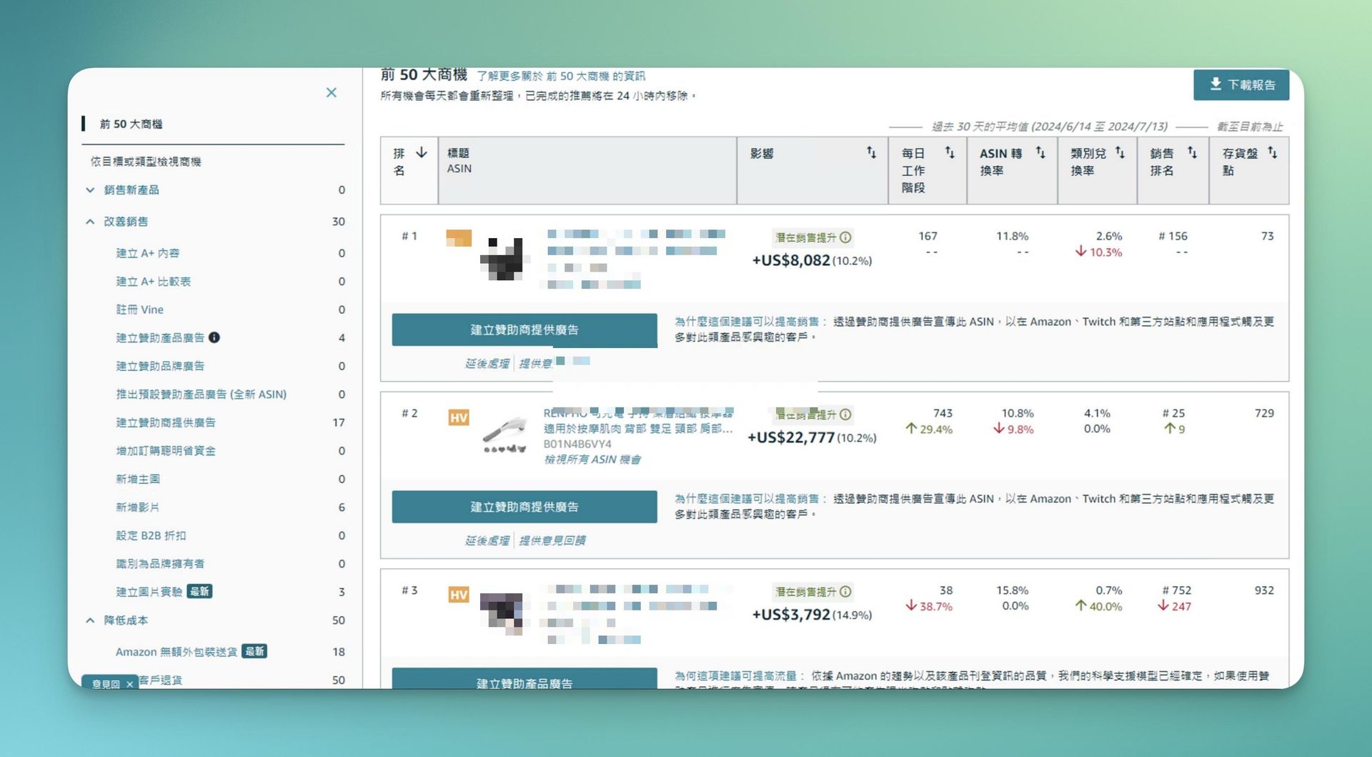 下面這張圖建議你放大看一下,左側是 Amazon 基於你所有面向的數據,根據他自己的演算法,給你的行動方案建議,行話叫做「商機」。